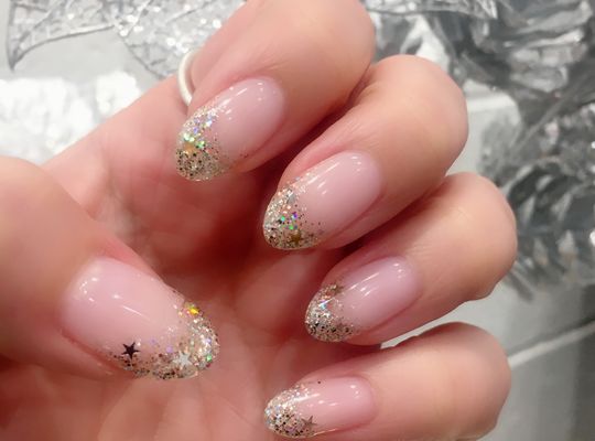 2019/12/11最近、お揃いにしてくれるお客様が たくさんで嬉しいてす♪ 2色のラメに、パールラメ、 2色の星もさりげなく入れ込んで、、、 大人なキラキラネイルです。 ... -